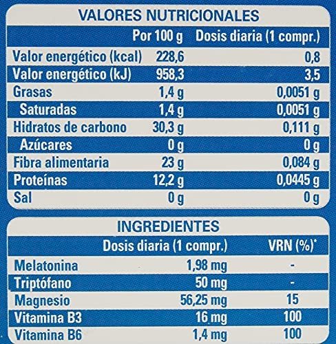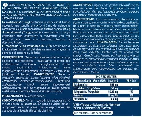 Óxido de magnesio, agente de carga (celulosa microcristalina), estabilizante (hidroxipropilmetilcelulosa), L-Triptófano, antiaglomerantes (talco), niacina (nicotinamida), antiaglomerante (sales magnésicas de ácidos grasos), melatonina, vitamina B6 (piridoxina clorhidrato). SIN AZÚCARES, APTO PARA VEGANOS..